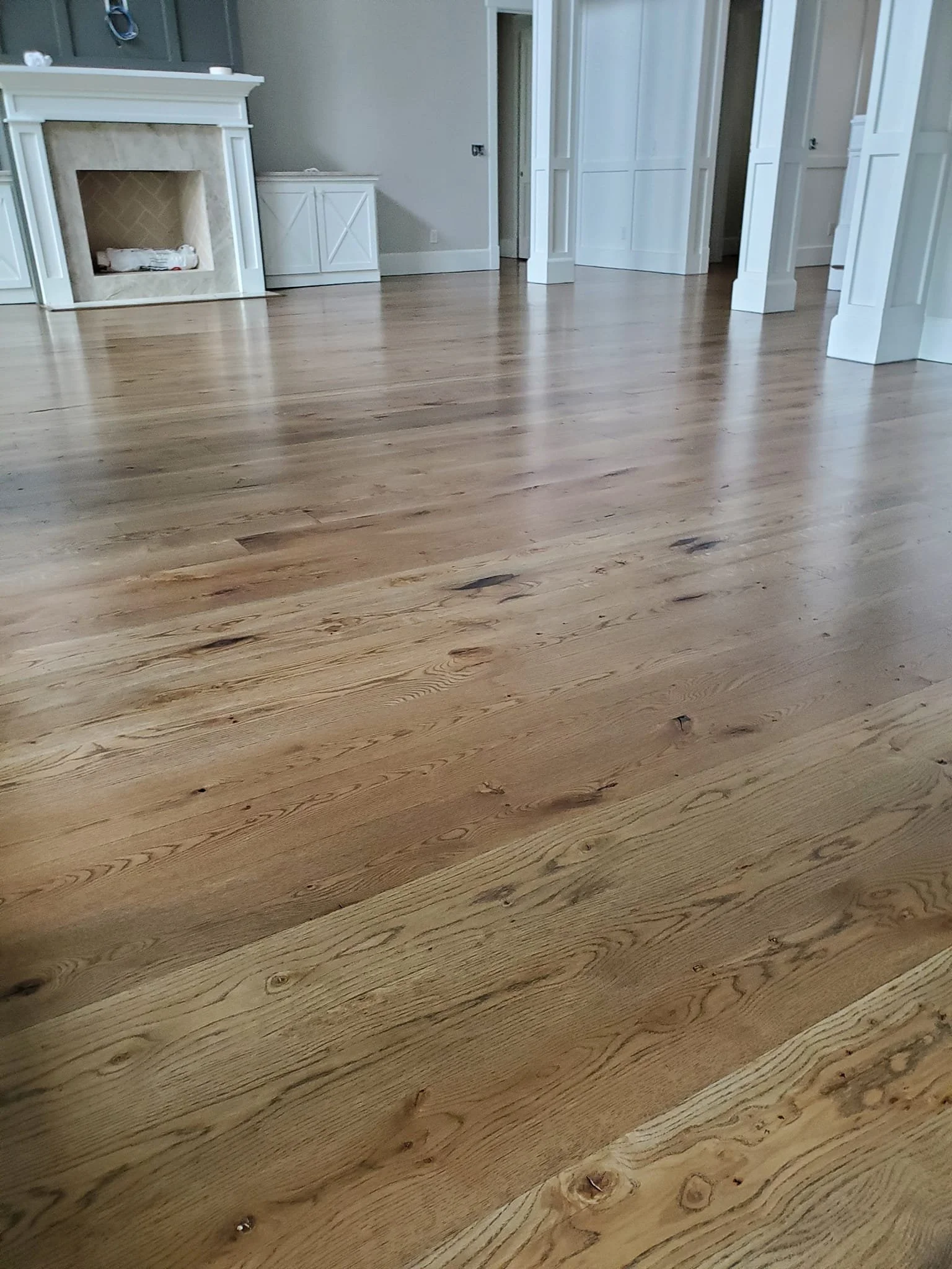 After all the sanding is complete each floor is vacuumed thoroughly then swiffed to make sure there is no grit or dust on the floor. At this point if we’re trying to achieve a certain color the floor can be water-popped which opens the wood grain back up after all the sanding and makes the floor absorb the stain a touch darker, water-popping extends the job sometimes by an extra day to allow drying time.